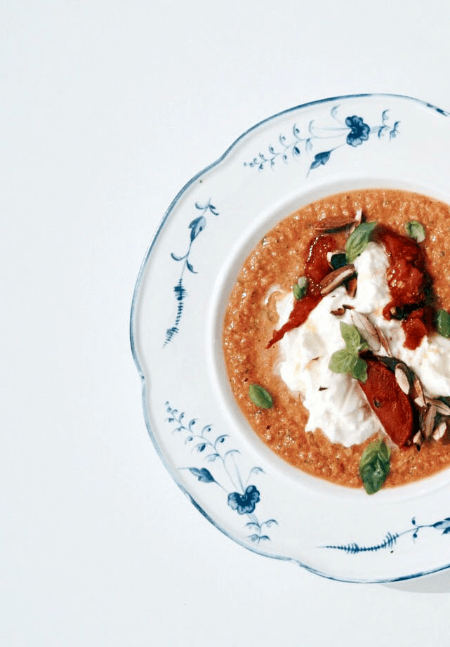 Crema al pomodoro con burrata, straccetti di pomodori arrostiti, mandorle tostate e qualche profumata fogliolina di basilico.