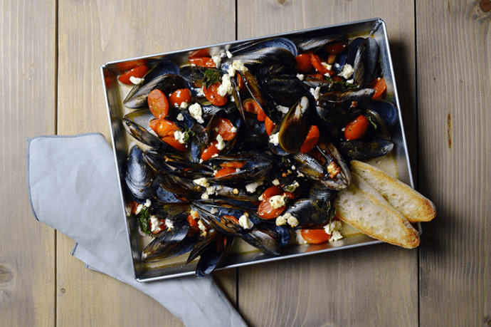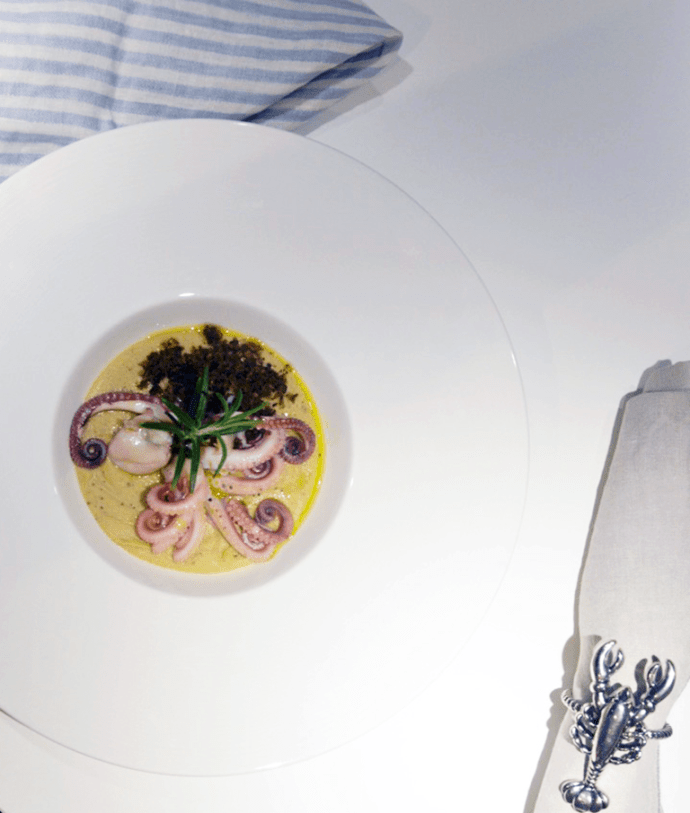 Una cremosissima purea di fave resa deliziosa da un twist di pecorino, accompagnata da cozze fresche adagiate su delle briciole piccanti super crunchy.