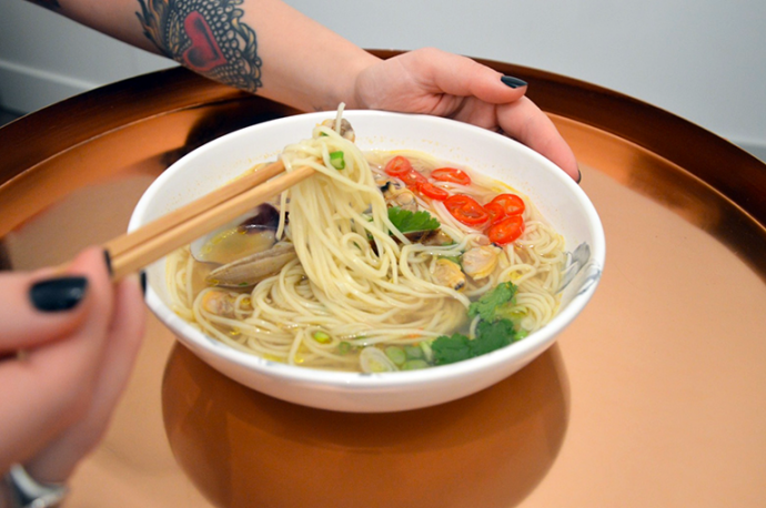 Noodles in brodo con saporite vongole veraci al profumo affumicato della paprika.
