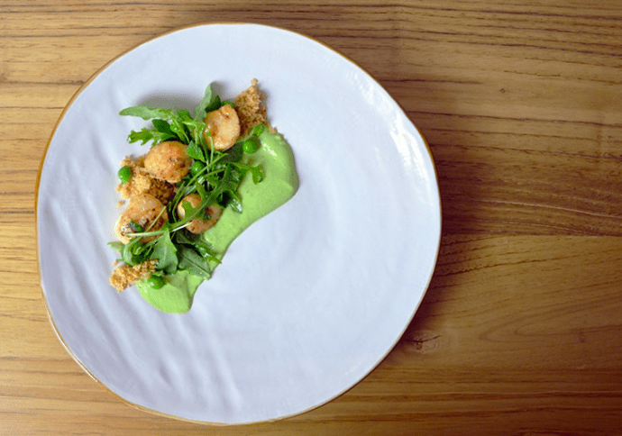 Capesante accompagnate da una crema allo yogurt al profumo di menta, insalatina di rucola e sabbia al limone.