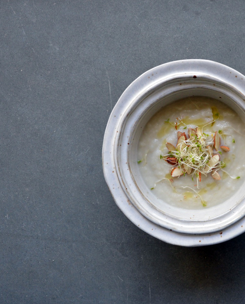Vellutata di daikon e topinambur, con scaglie di mandorle e germogli alfa-alfa. E’ primavera ed è tempo di piatti leggeri e depurativi. Questa crema combina ingredienti deliziosi, con proprietà benefiche essenziali.