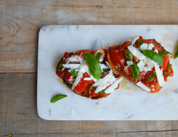 Estiva, semplice e senza tempo. La bruschetta al pomodoro e’ un classico antipasto italiano. Qui una versione rivista con l’aggiunta di un paio di ingredienti sfiziosi.
