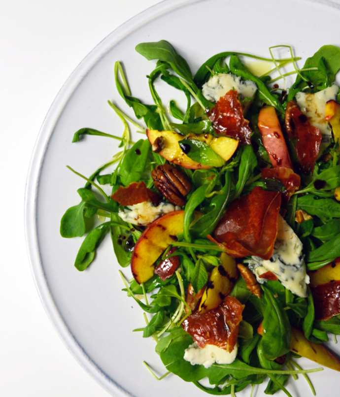Una ricetta velocissima per un pranzetto estivo che vede la dolcezza delle pesche abbinate al gusto deciso del gorgonzola, alla croccantezza delle noci pecan (le più deliziose al mondo!) e alla fragranza del prosciutto tostato in forno.