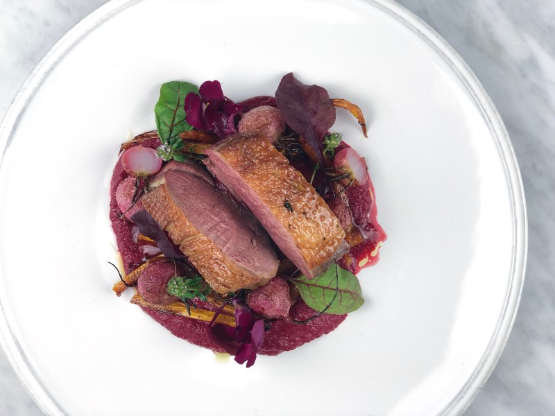 Un delizioso petto d’anatra accompagnato da un dolce pure’ di barbabietole rosse super chic e un mix di verdurine colorate e fragranti.