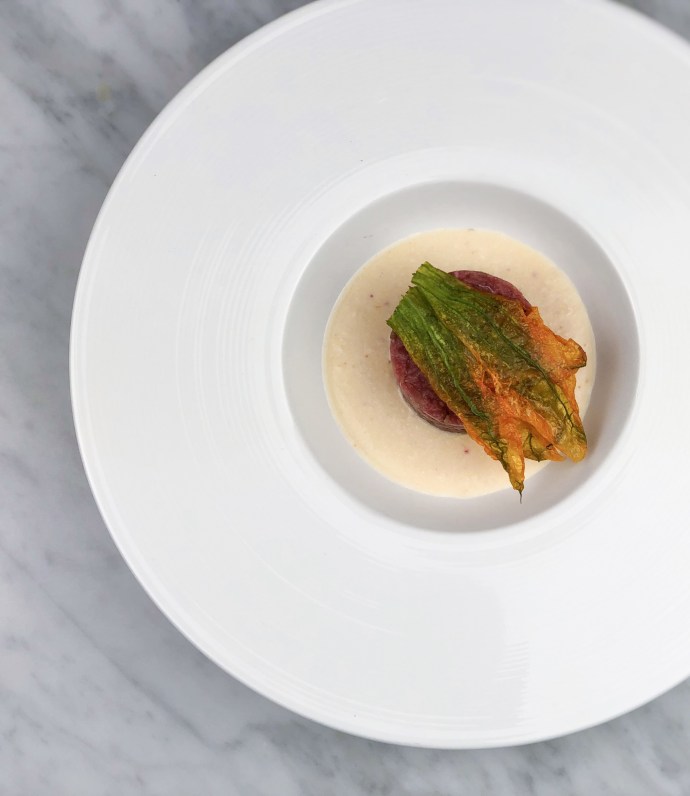 La tartare di manzo è insaporita da un battuto di capperi di Pantelleria, mentre la crema è di mozzarella fior di latte aromatizzata con speziati pistilli di zenzero del Marocco. La chips di fiore di zucca completa il piatto con una nota di colore e fragranza.