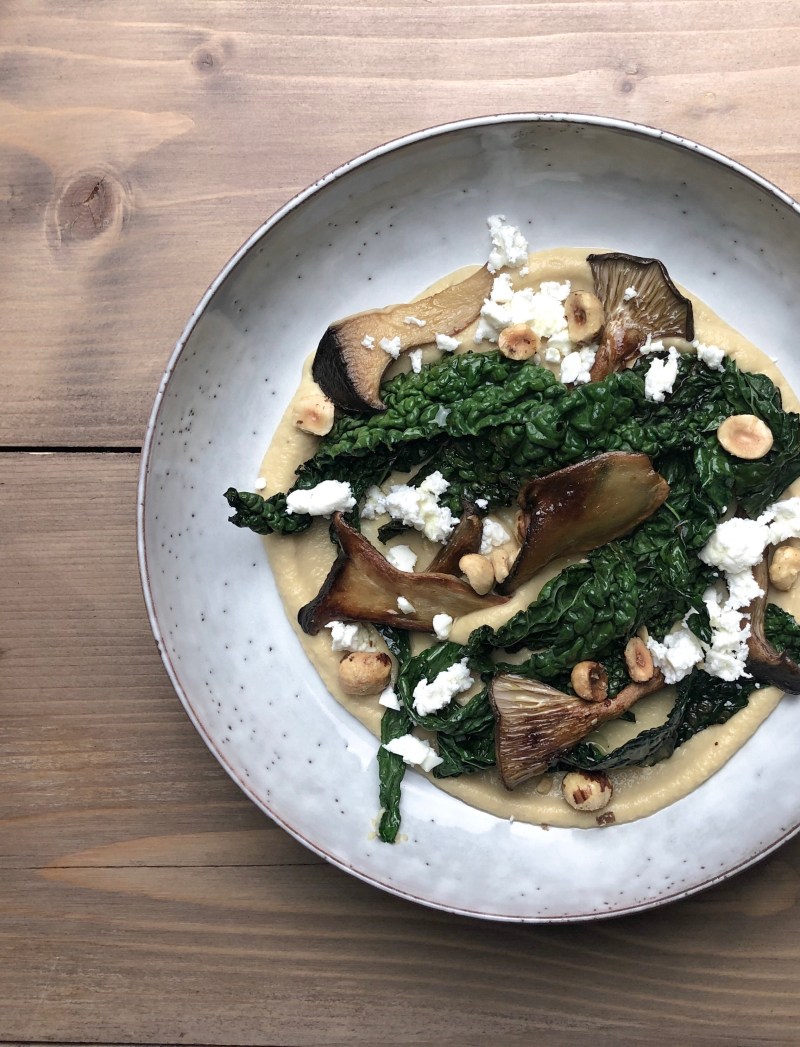 E’ l’autunno in un piatto che accosta funghi cardoncelli rosolati, cavolo nero leggermente stufato e crema di ceci con un pizzico di noce moscata.