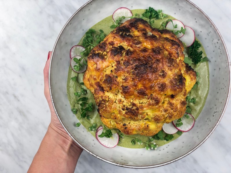 E’ da tanto che volevo provare a cucinare il cavolfiore intero al forno, che devo dire essere molto scenografico. Il cavolfiore è marinato al suo interno con dell’olio evo ed erbe aromatiche, mentre all’esterno è ricoperto da yogurt greco aromatizzato alla curcuma. Per renderlo ancor più speciale, l’ho accompagnato da una cremosa salsa di curry…
