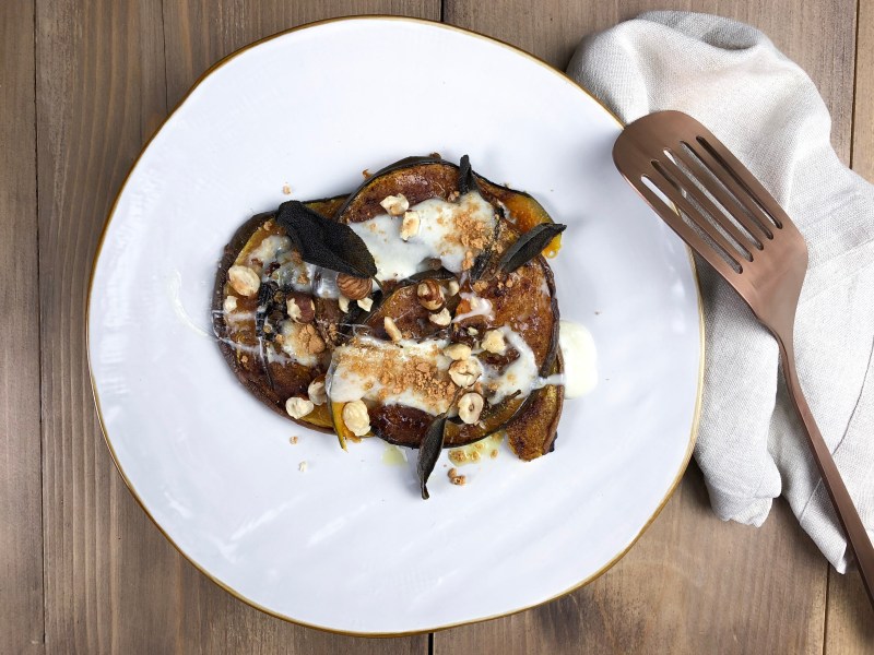 In questo piatto ho cucinato zucca mantovana al forno con una spolverata di cannella e salvia fresca, accompagnata da una delicata fonduta di toma di capra, crumble di amaretti e nocciole tostate.