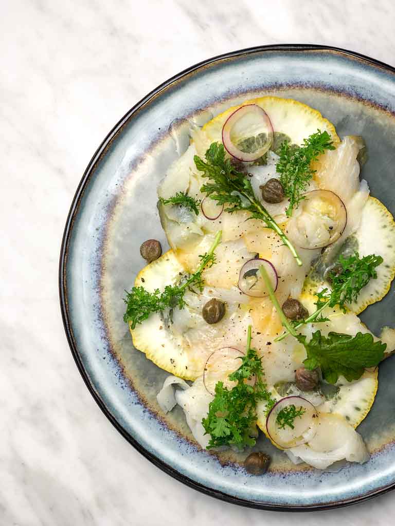 Un antipasto fresco, profumato e veloce da preparare: carpaccio di baccala’ affumicato e cedro, con capperi di pantelleria, cipollotti rossi e qualche fogliolina di senape riccia e wasabina, per aggiungere un tocco green e spicy.