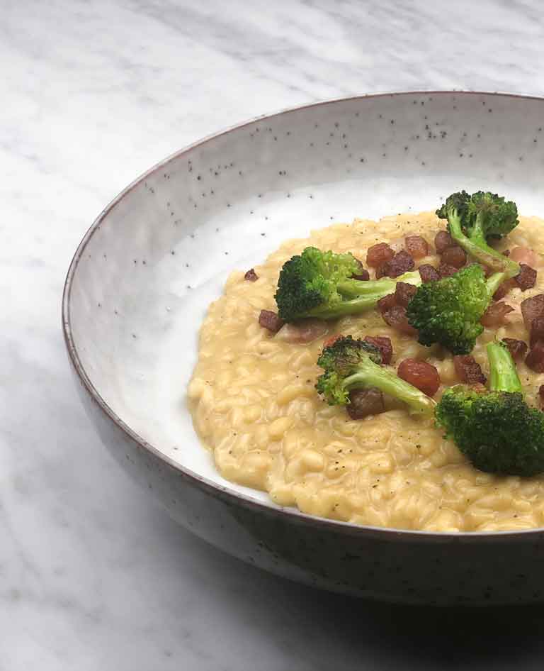La cremosità del riso con uova e pecorino romano, la croccantezza e sapidità del guanciale e il twist green delle cimette di broccolo.