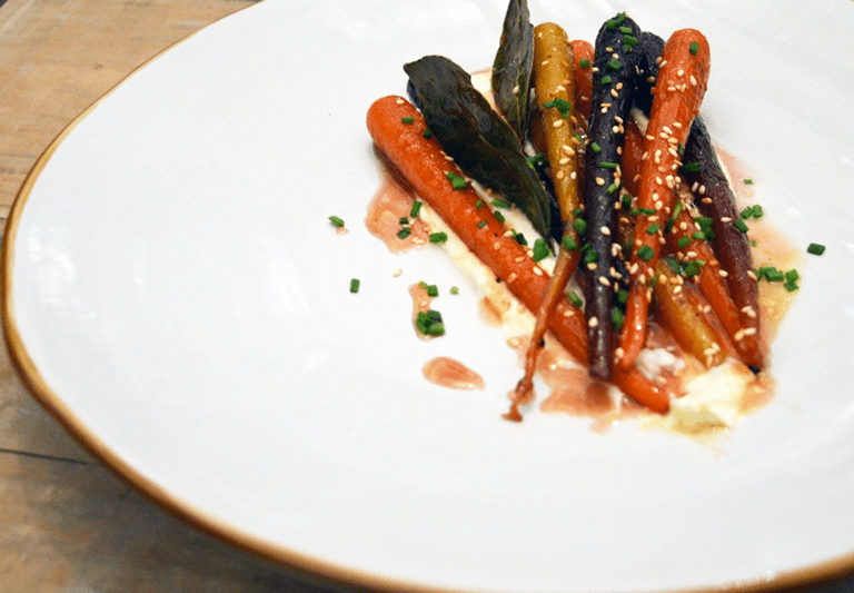 Prendete un piatto e disponete sul fondo la creme fraiche, che renderà la vostra portata veggy ancora più gustosa. Disponete sopra le carote e la salsina che si sarà formata durante la cottura.