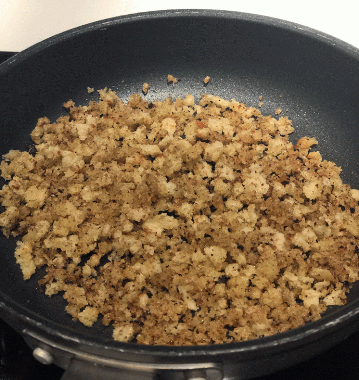 Preparate ora il pane. Rimuovete la crosta da due fatte di pane bianco o di grano duro. Se il pane non è raffermo – come sempre accade nel mio caso -, fate dorare per qualche minuto le fatte in un tostapane o in padella. Con l’aiuto di un coltello, riducete il pane in briciole grossolane.