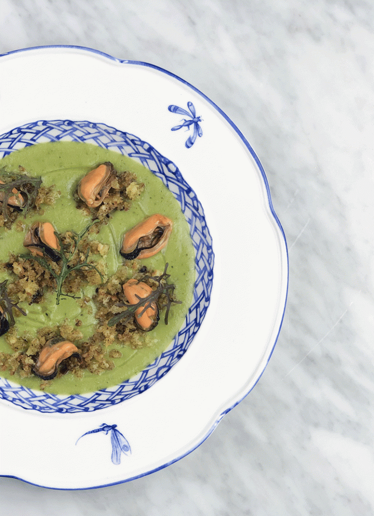 Una cremosissima purea di fave resa deliziosa da un twist di pecorino, accompagnata da cozze fresche adagiate su briciole piccanti super crunchy.
