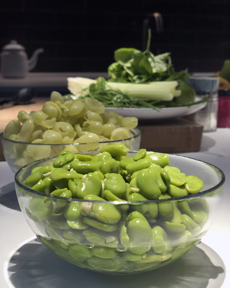 In una pentola con acqua bollente fate cuocere le fave per qualche minuto. Una volta sbollentate, riponete in una ciotola con dell’acqua fredda (questo passaggio vi aiuterà a rimuovere la buccia più facilmente).