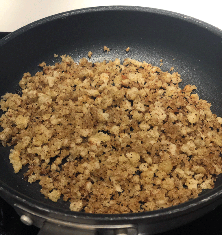 Preparate ora il pane. Rimuovete la crosta da due fatte di pane bianco o di grano duro. Se il pane non è raffermo – come sempre accade nel mio caso -, fate dorare per qualche minuto le fatte in un tostapane o in padella. Con l’aiuto di un coltello, riducete il pane in briciole grossolane.