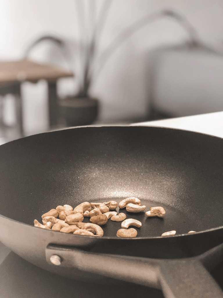 Mettete a tostare gli anacardi in un wok per qualche minuto, finché non saranno dorati.