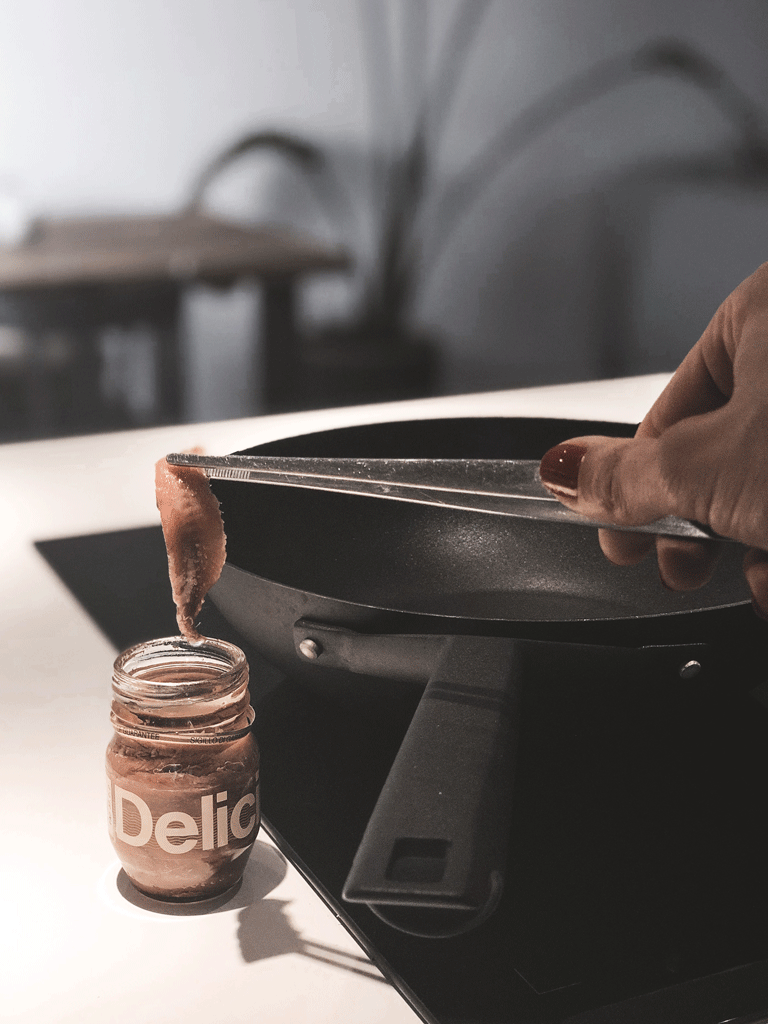 Nel frattempo, mettete 4 acciughe all’interno del wok – io ho utilizzato quelle sott’olio conservate in vetro di Delicius che trovo buonissime -, insieme a due spicchi di aglio in camicia schiacciati, mezzo peperoncino piccante fresco e un filo di olio extra vergine di oliva. Fate soffriggere per un paio di minuti. Le acciughe si ridurranno e daranno una sferzata di sapore di mare al piatto.
