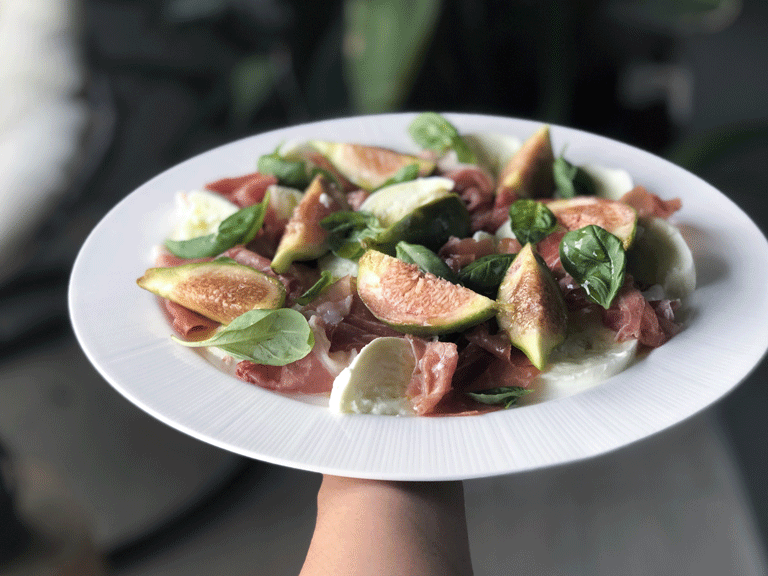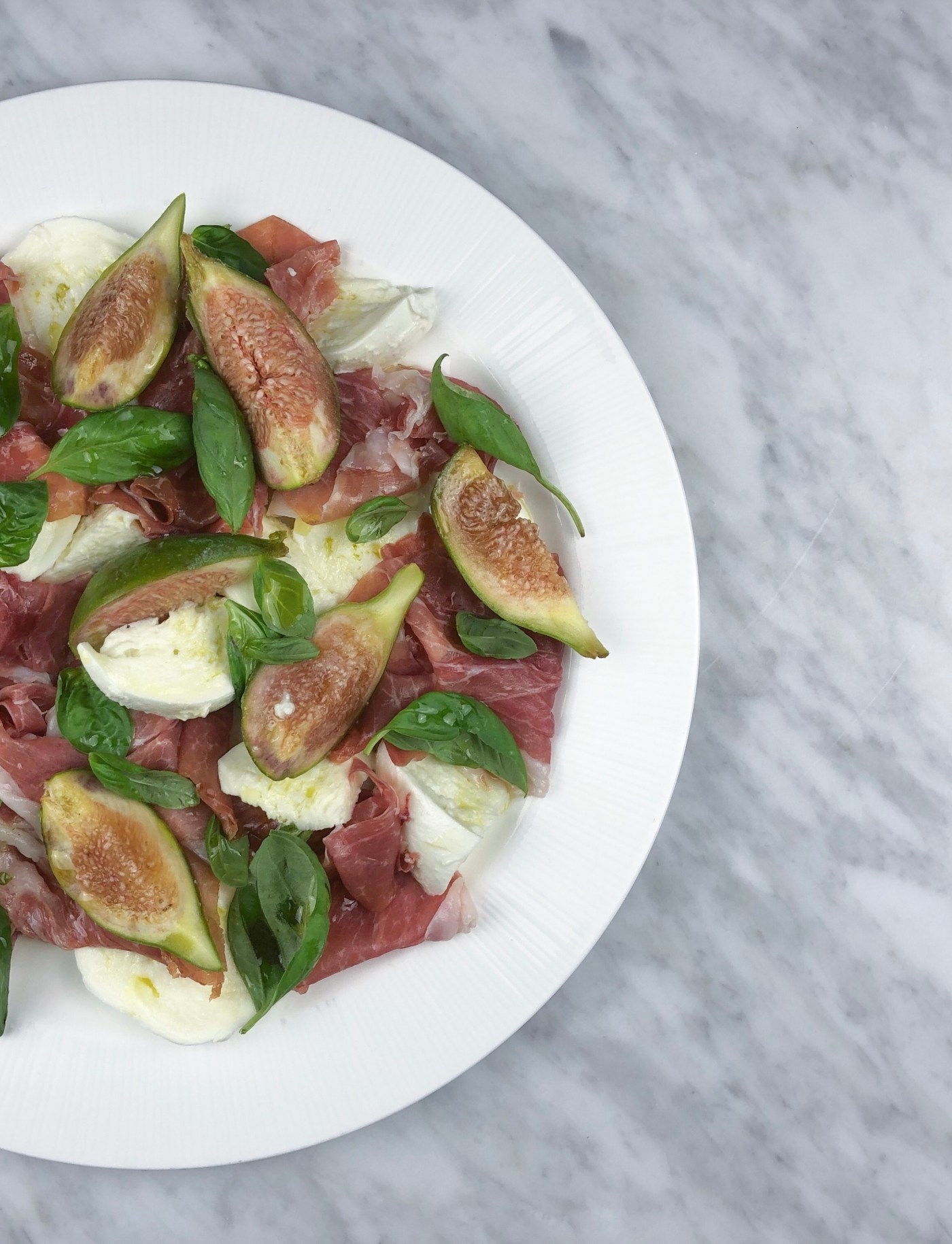 Adagiate le fette sottili di prosciutto crudo di Parma, i fichi, disposti in ordine casuale, e qualche fogliolina di basilico fresco.