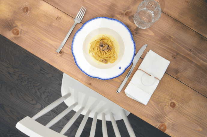 Il classico spaghetto alle vongole reso ancora più squisito da una delicata salsa all’aglio dolce.
